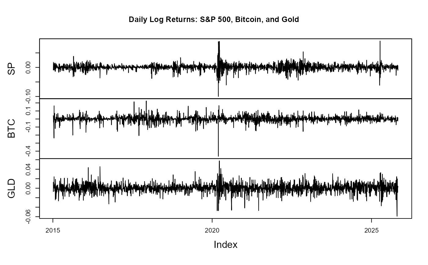 Daily log returns for S&P 500, Bitcoin, and Gold